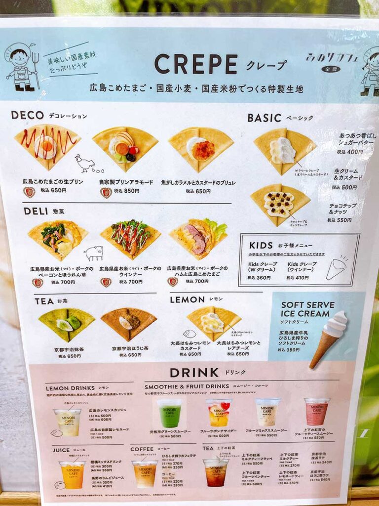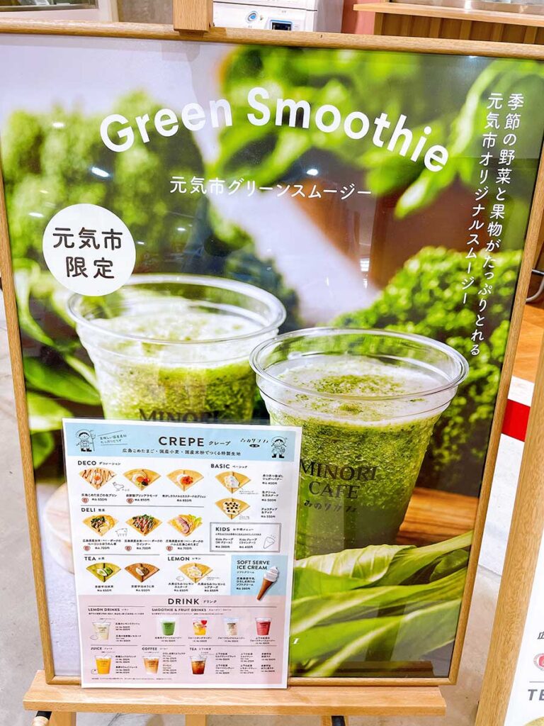 館内のテナントさんのポップに「国産米粉でつくる生地」と文字とクレープの写真。