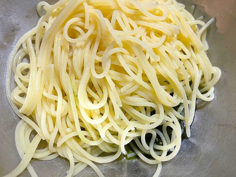 茹であがったらソースを入れたボールにドボンして混ぜ混ぜ。
