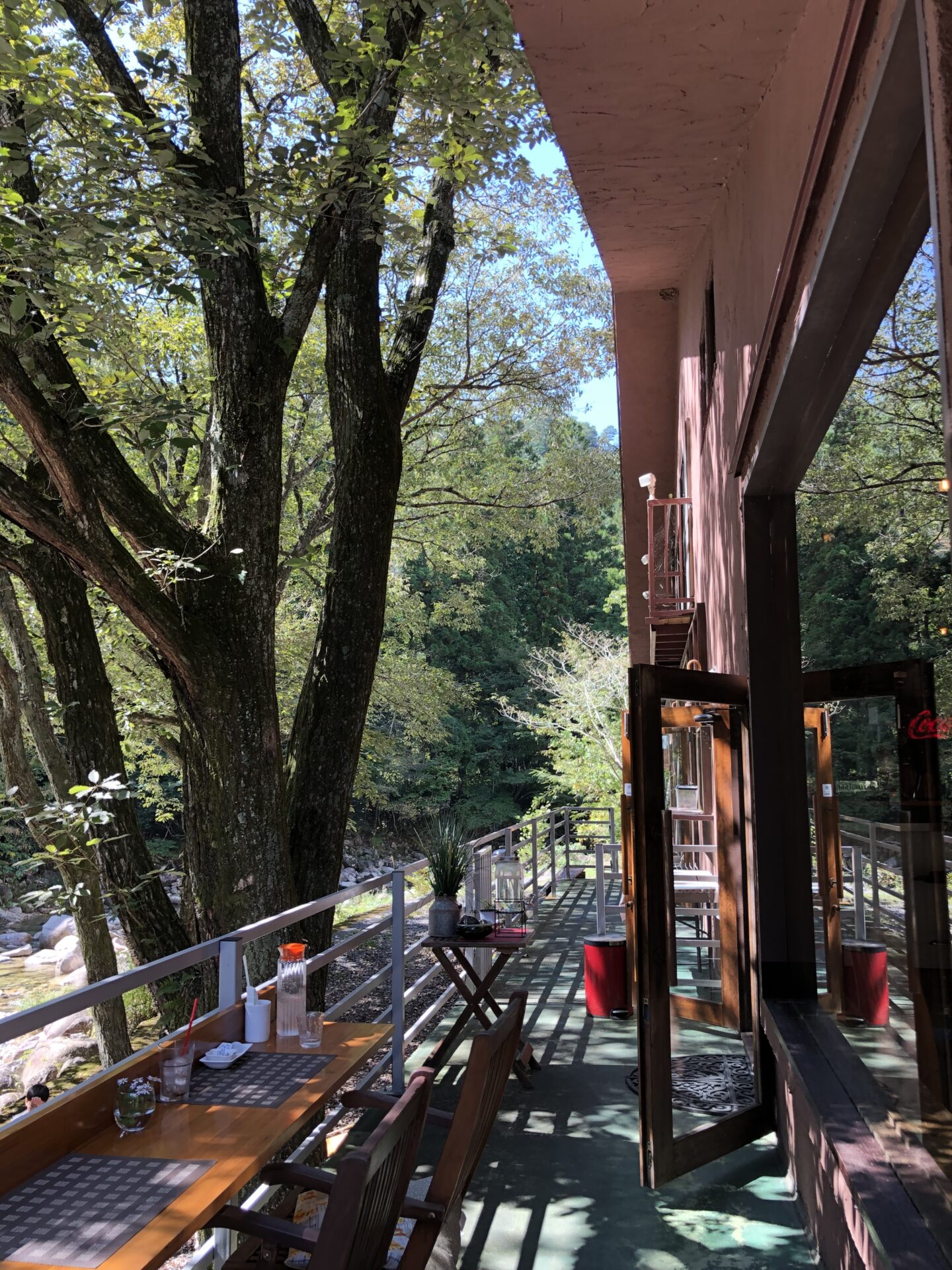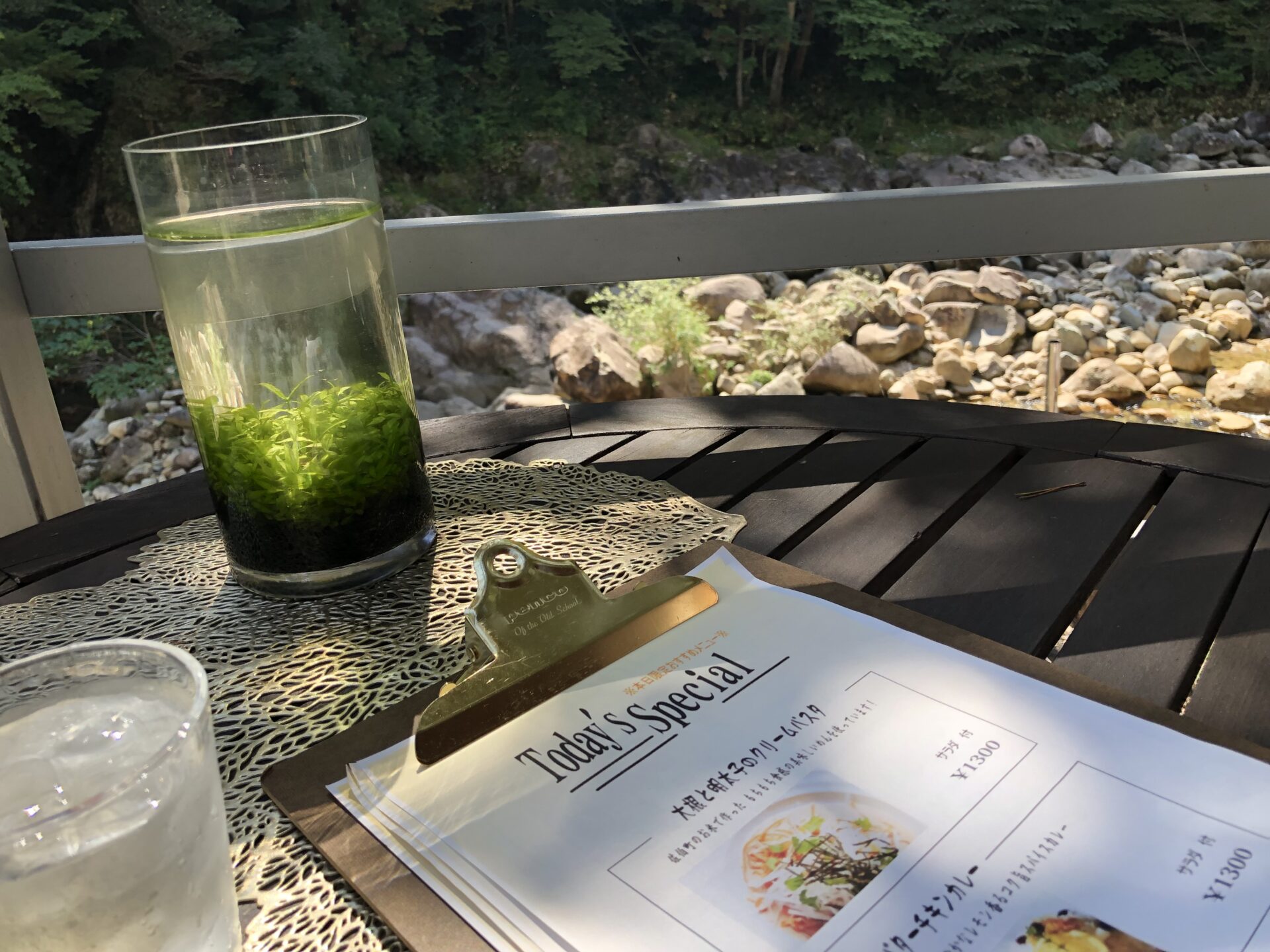 広々とした店内は開放感に溢れ、テラスに出ると目の前は森と川のみ。
