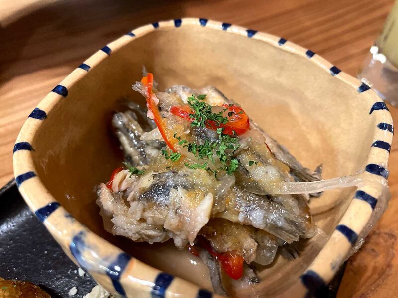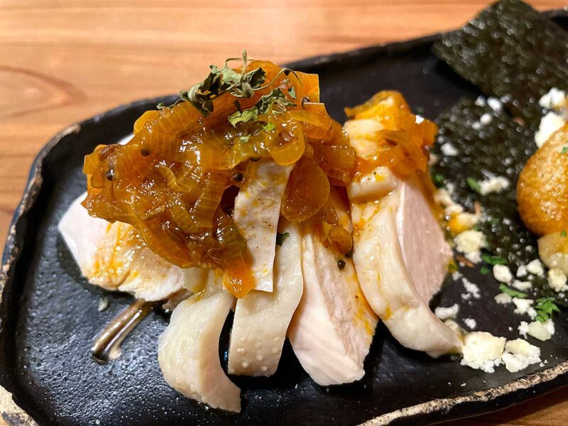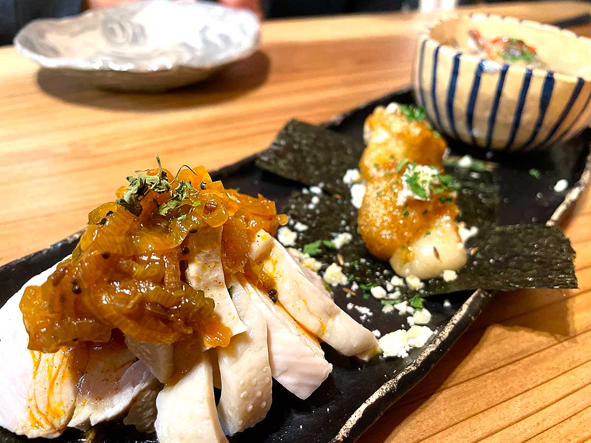 選べるちょこっと盛合わせ3種の蒸し鶏にスパイスねぎダレ、クミン醤油のいそべモチ、小魚のエスカベッシュをまずオーダー。