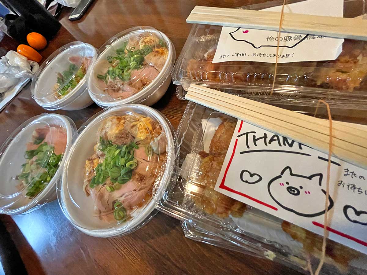 豚丼を受け取り、帰り際に「これ、良かったら使ってください」と差し入れを進呈。