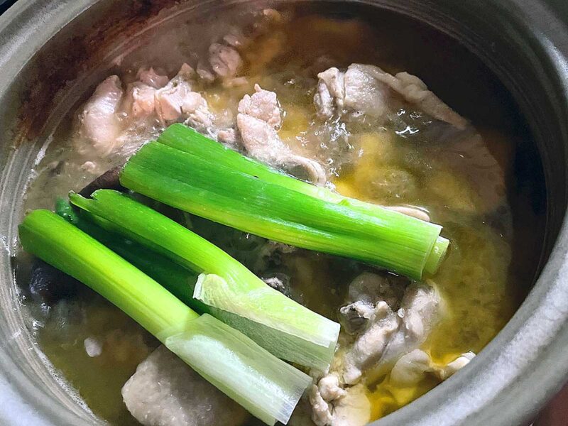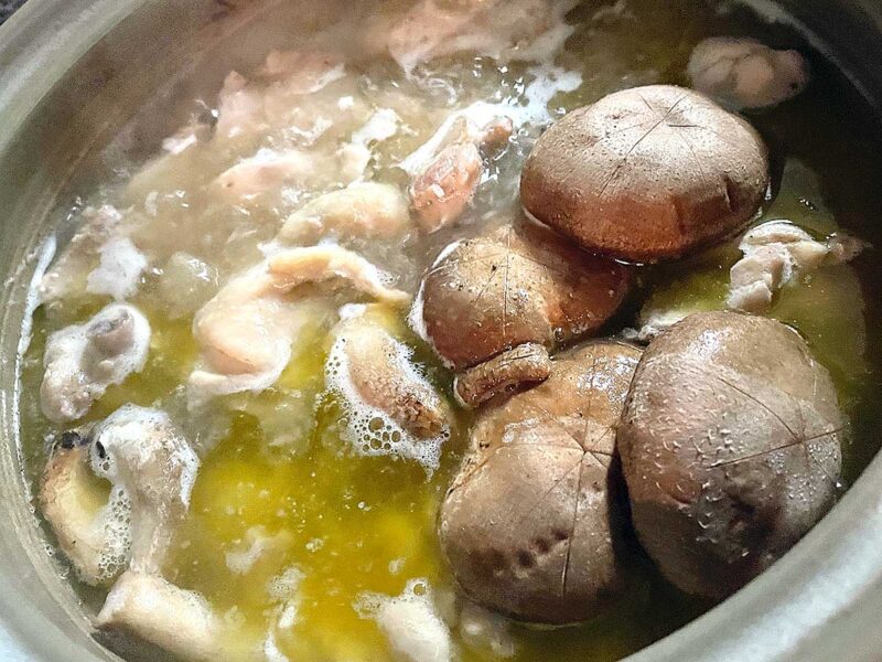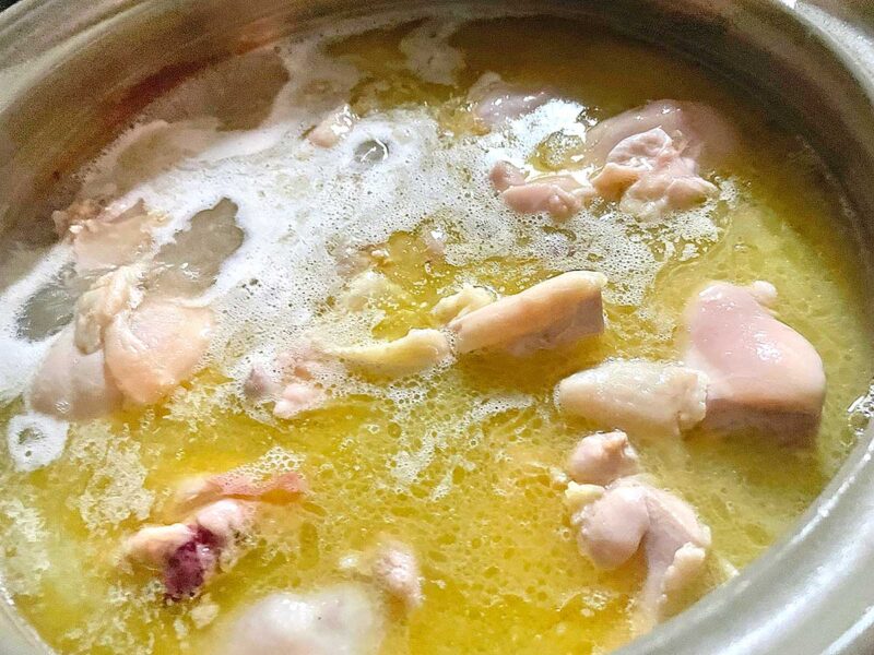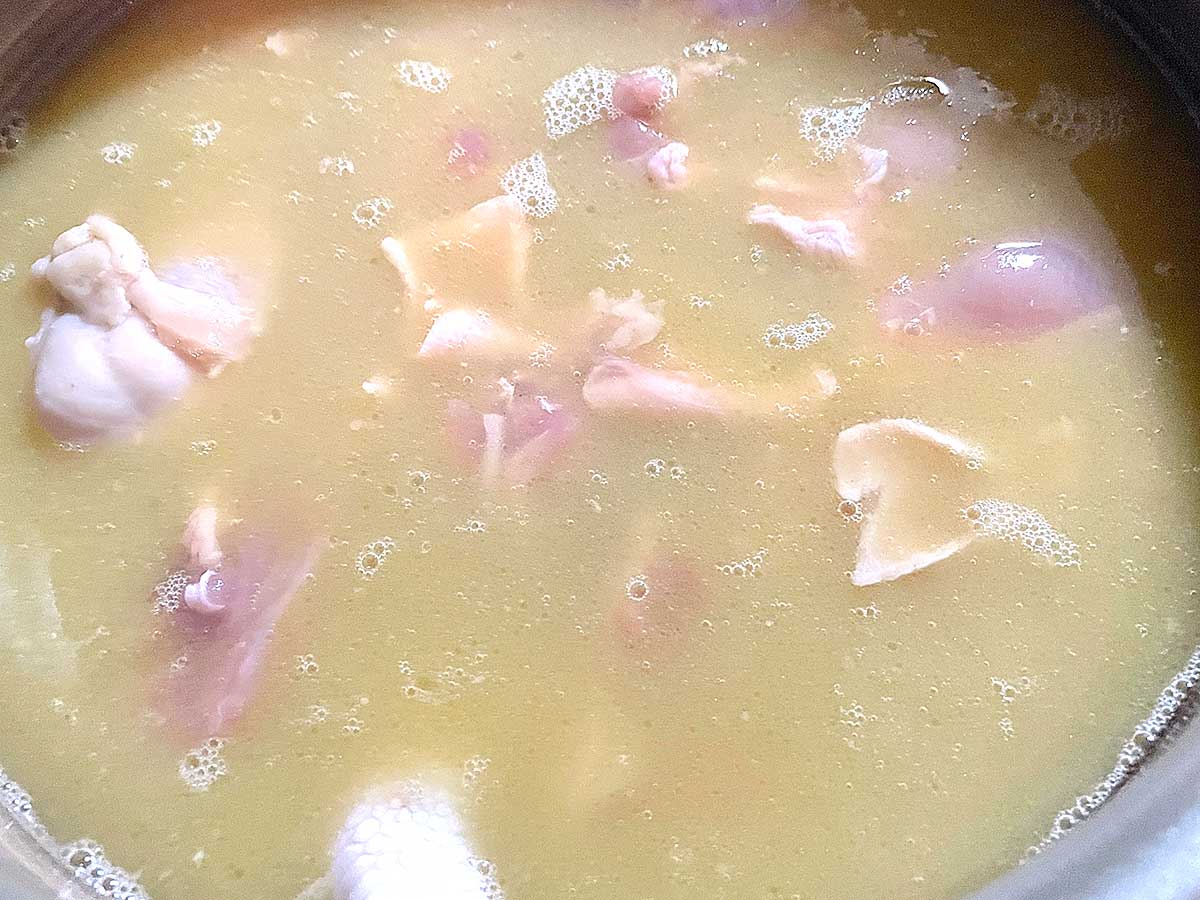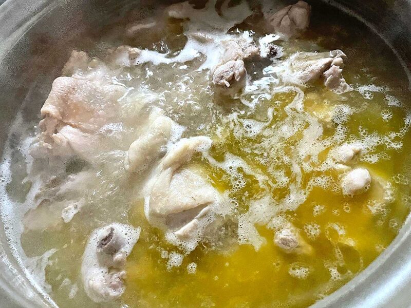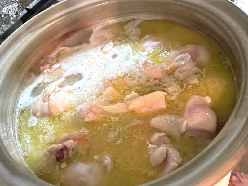 鶏肉を寝かし終わったら、お鍋にスープを入れて鶏肉を煮ていきます。