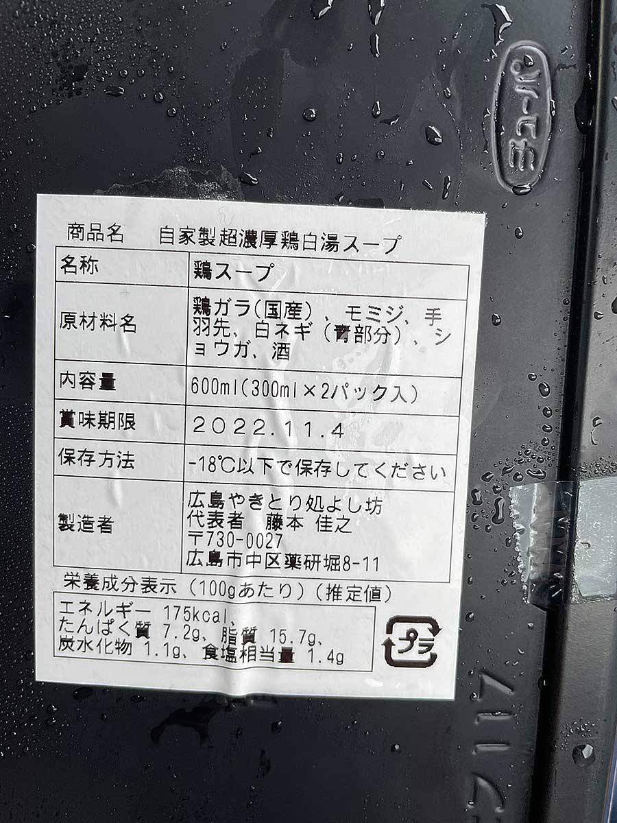 • 広島やきとり処よし坊自家製超濃厚鶏白湯スープ」・・・300ml×2