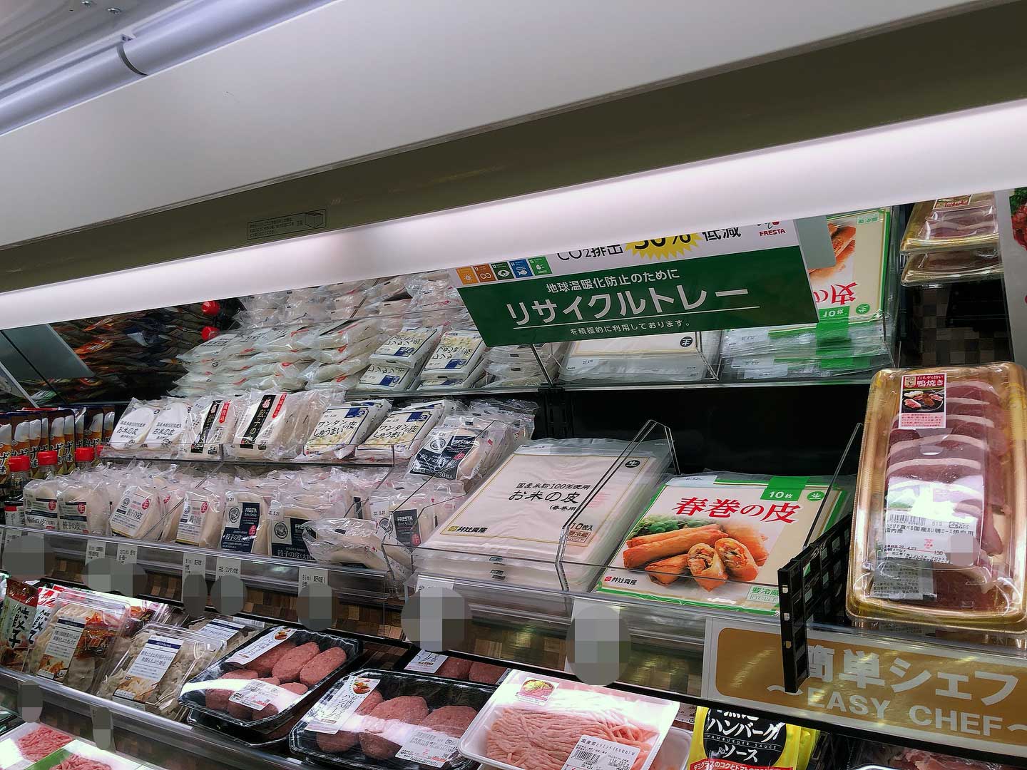 そこから加工食品コーナーに移ると、安定の「みんなの食卓シリーズ」と井辻食品さんの「米粉餃子の皮」と春巻用の「お米の皮」を発見。