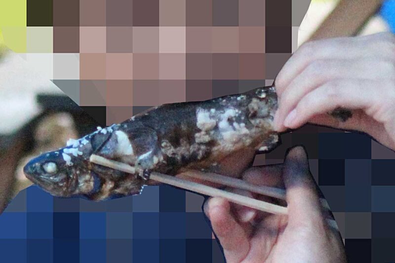 捕まえた川魚は1尾400円で買取り、内臓を割り箸で抜き取った後塩を振って網焼きにして頂く事ができます。(塩焼き代1尾100円)