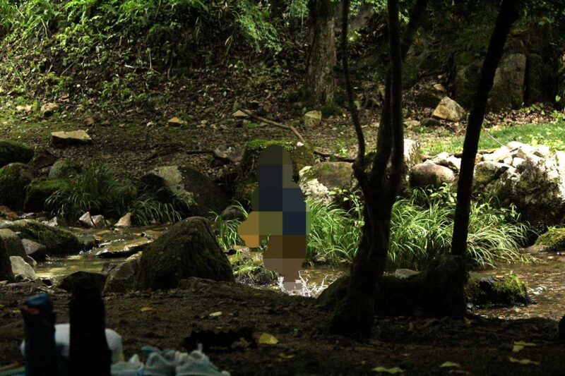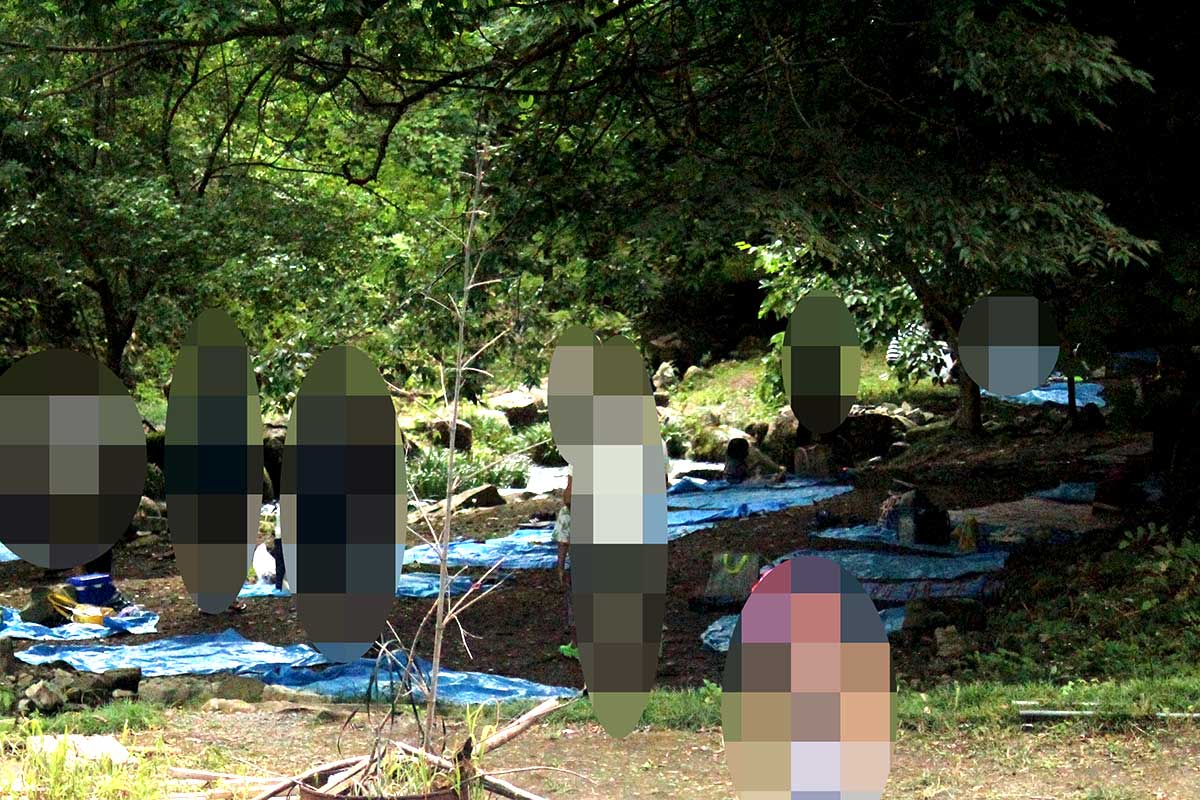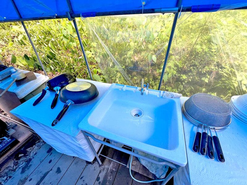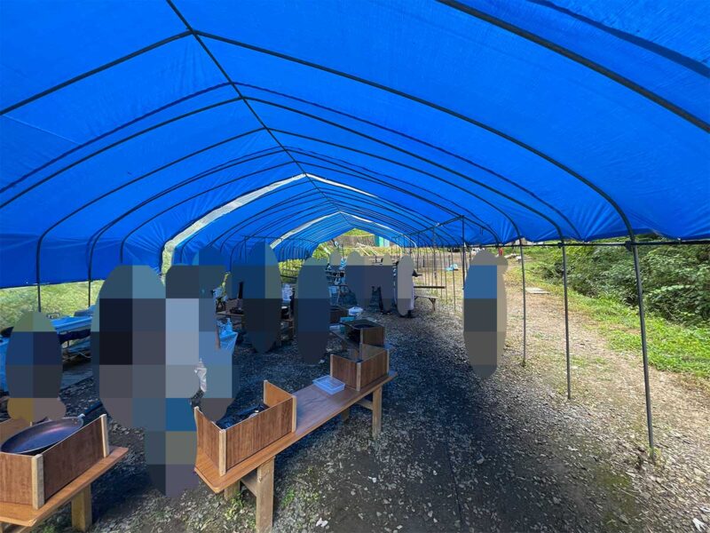 小川沿いに敷かれたブルーシートを利用する事ができます。(予約推奨)
