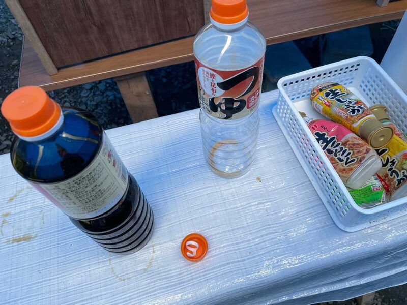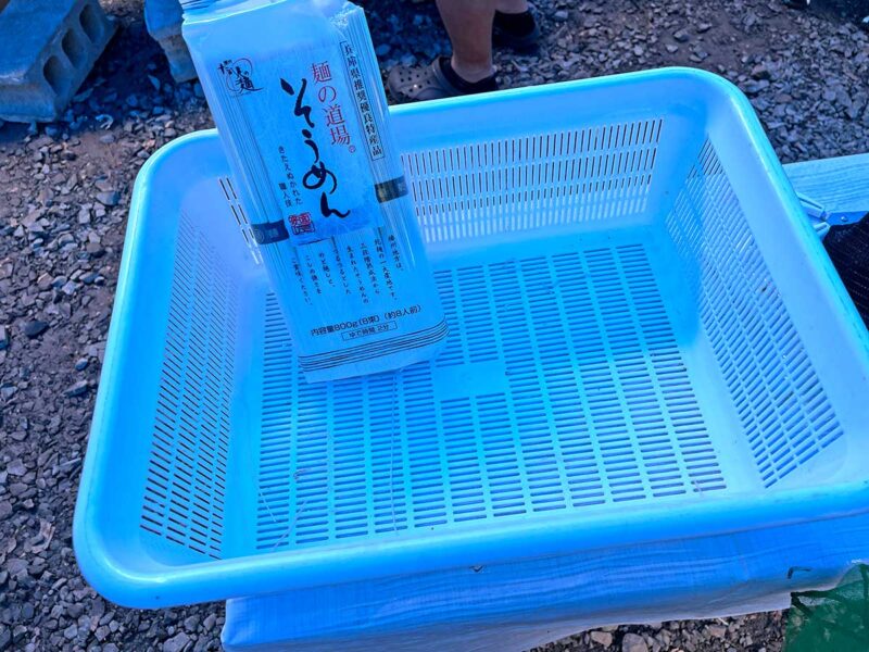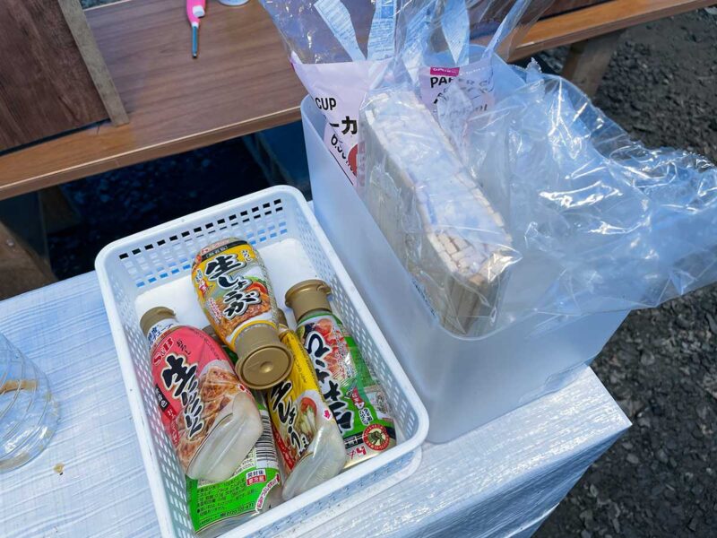 そうめんを茹でるコンロや鍋、シンクが常設されてるうえ、箸や麺つゆ用の紙コップ、そして薬味の生しょうが、生わさび、生にんにく(そうめんの薬味で始めてみました笑)まで揃っており、更には、、、そうめん自体も茹で放題食べ放題です(笑)