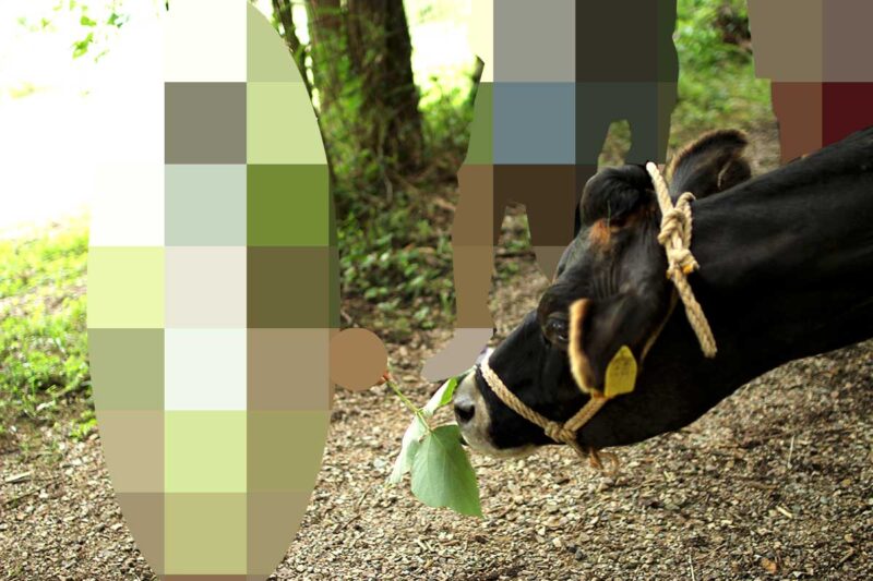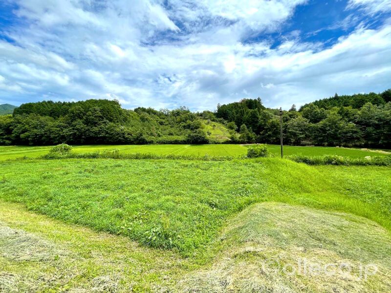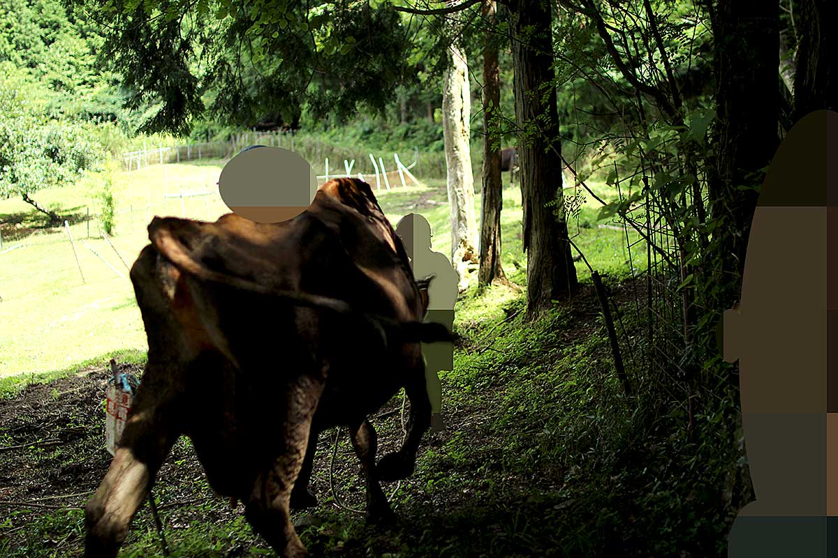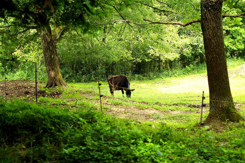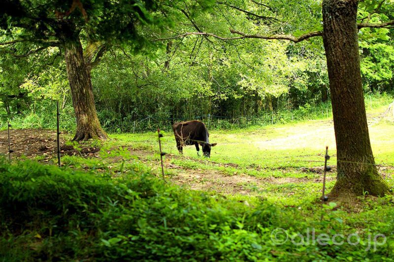 草木が生い茂る山道を少し登っていくとすぐ目の前に牛が放たれた牧場があります。